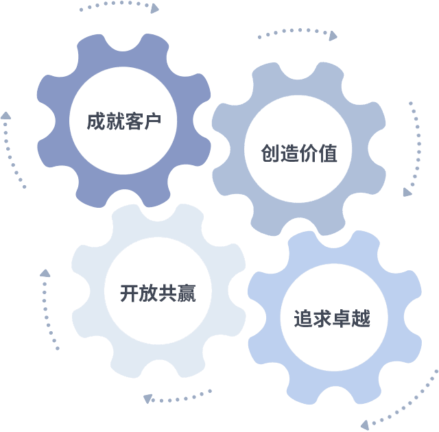 成就客户是一切决策的出发点,,,,创造价值是衡量所有工作的标准,,追求卓越是我们做事做人的态度,,,,开放共赢是我们的格局也是最终的结果。。。。价值观的齿轮环环相扣,,,推动着组织里的每个人不断向前。。
