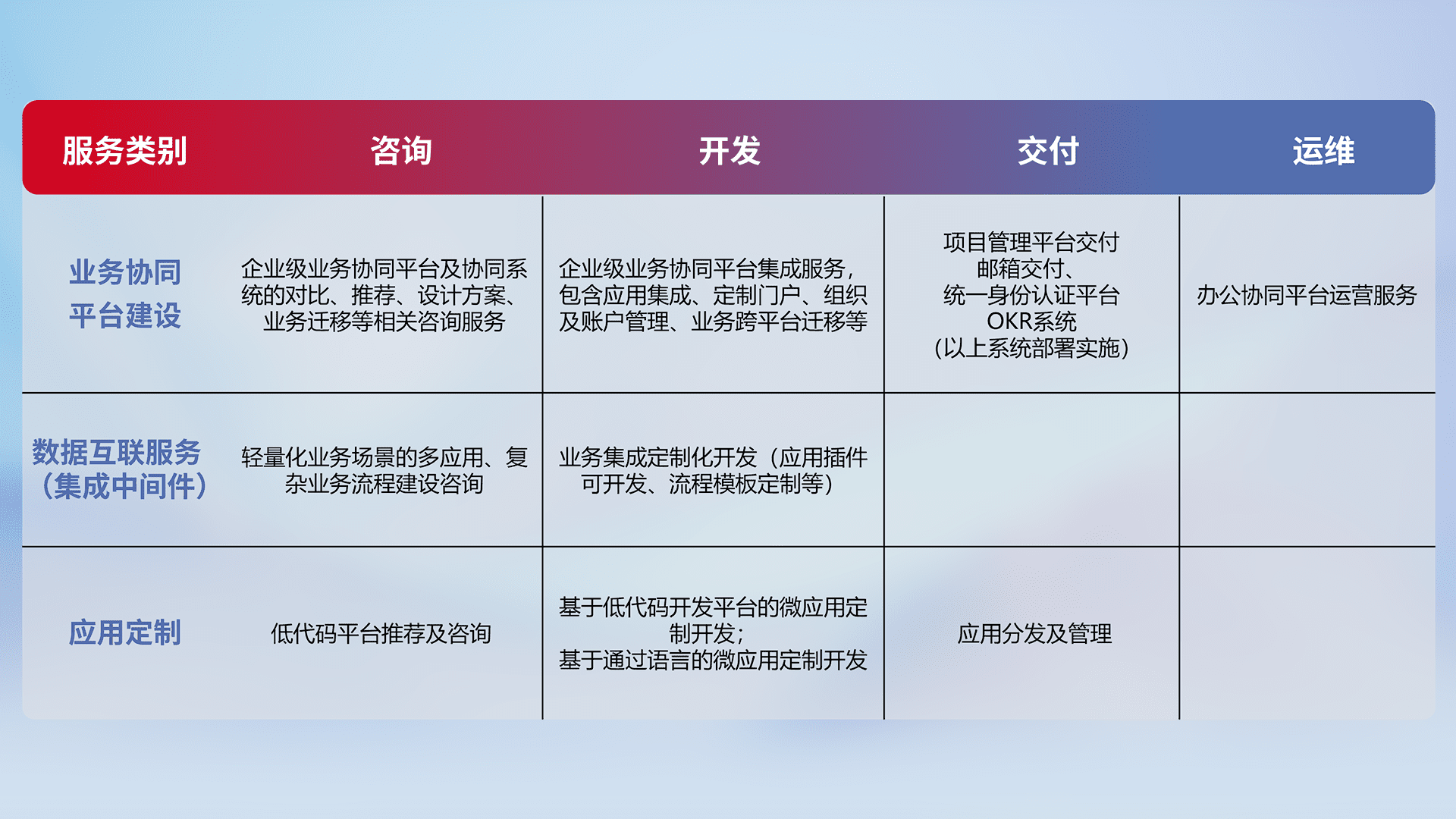 针对钉钉、、企微、、、、IDaas等平台级产品提供产品的规划、、方案、、、交付、、、、定制化开发等服务,,实现如统一协同办公、、、智能客户服务、、、、混合会议管理、、、、智能数据查询、、、、等业务场景,,,实现数字化转型。。